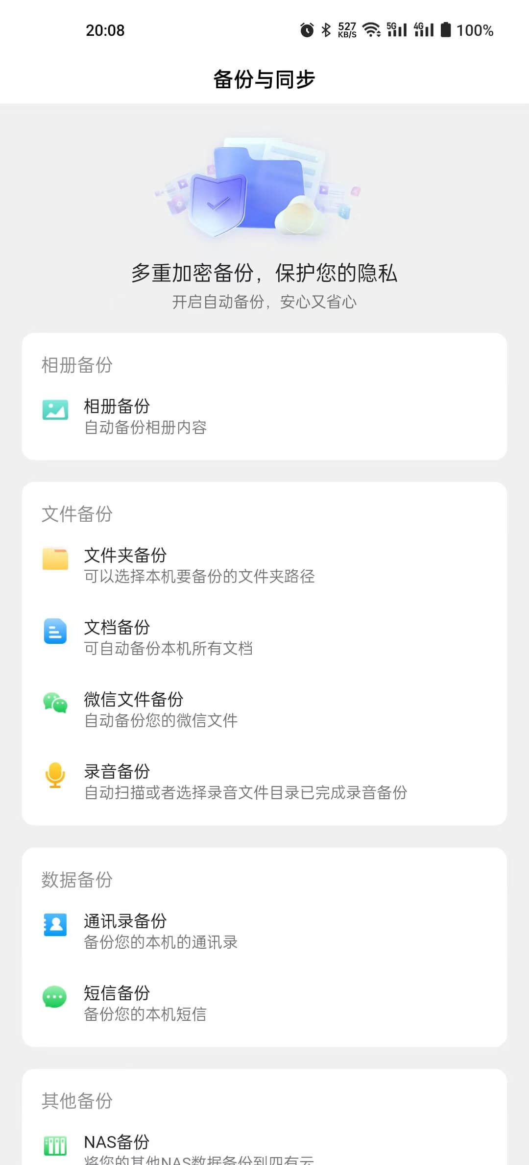 支持相册、通讯录、录音、文件夹、微信文件、TimeMachine等多种备份方式;更有安全感的四有云,您可以更安心的备份;独立智能相册APP可以支持更灵活的自动备份与空间释放
